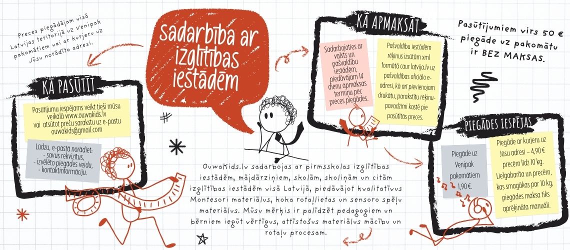 OuwaKids.lv sadarbojas ar pirmsskolas izglītības iestādēm, mājdārziņiem, skolām, skoliņām un citām izglītības iestādēm visā Latvijā, piedāvājot kvalitatīvus Montesori materiālus, koka rotaļlietas un sensoro spēļu materiālus. Mūsu mērķis ir palīdzēt pedagogiem un bērniem iegūt vērtīgus, attīstošus materiālus mācību un rotaļu procesam.